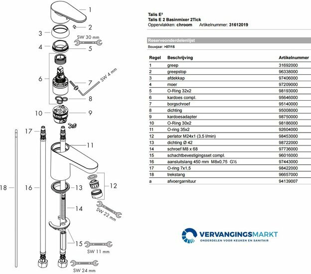Here you can order all spare parts for the Hansgrohe Talis E 31612019 basin faucet Production Year 07-2015 to Present